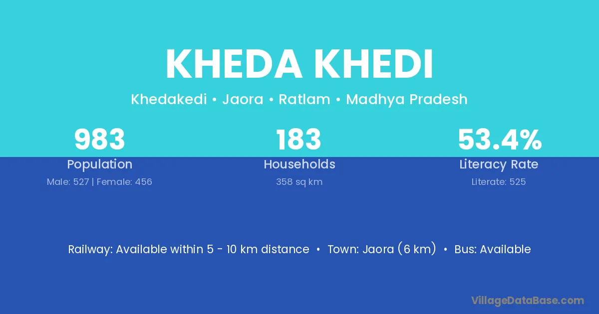 Kheda Khedi village has a total population of 983 people, of which 527 are males and 456 are females.