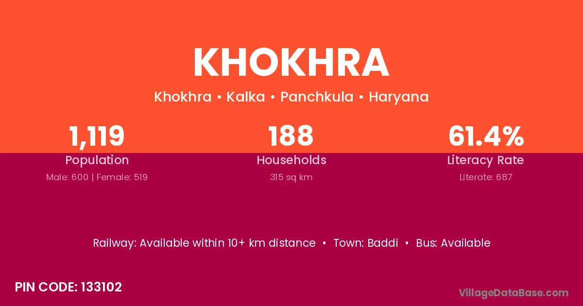 Khokhra village has a total population of 1,180 people, of which 590 are males and 590 are females.