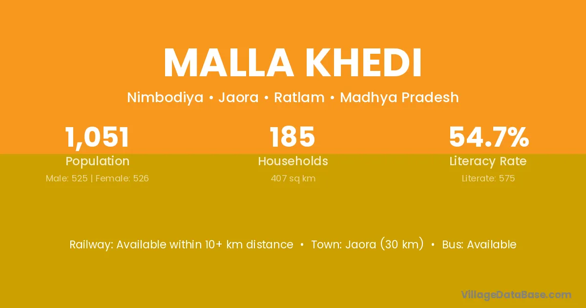 Malla Khedi village has a total population of 1,051 people, of which 525 are males and 526 are females.