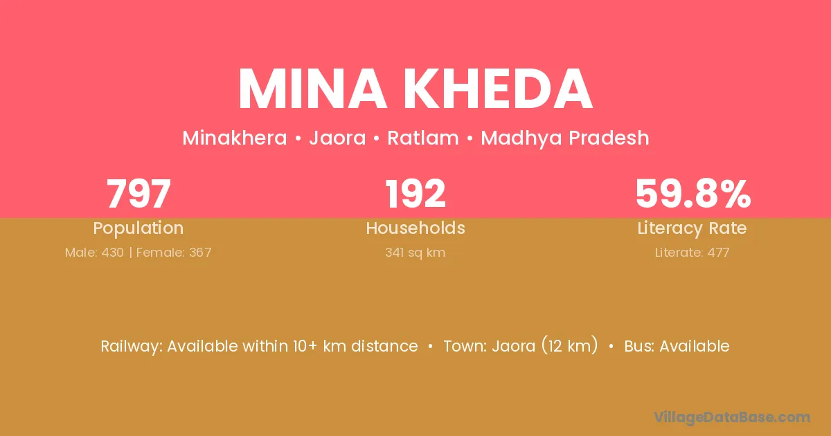 Jaora (12 km) is the nearest town to Mina Kheda village for major economic activities and is located approximately 12 km away.