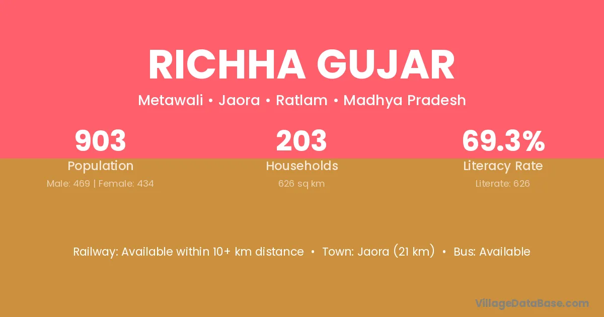 Jaora (21 km) is the nearest town to Richha Gujar village for major economic activities and is located approximately 21 km away.