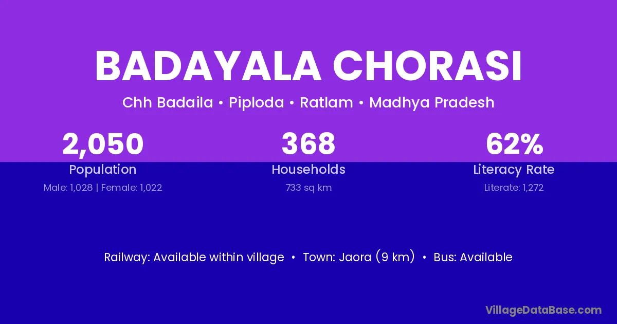 Jaora (9 km) is the nearest town to Badayala Chorasi village for major economic activities and is located approximately 9 km away.