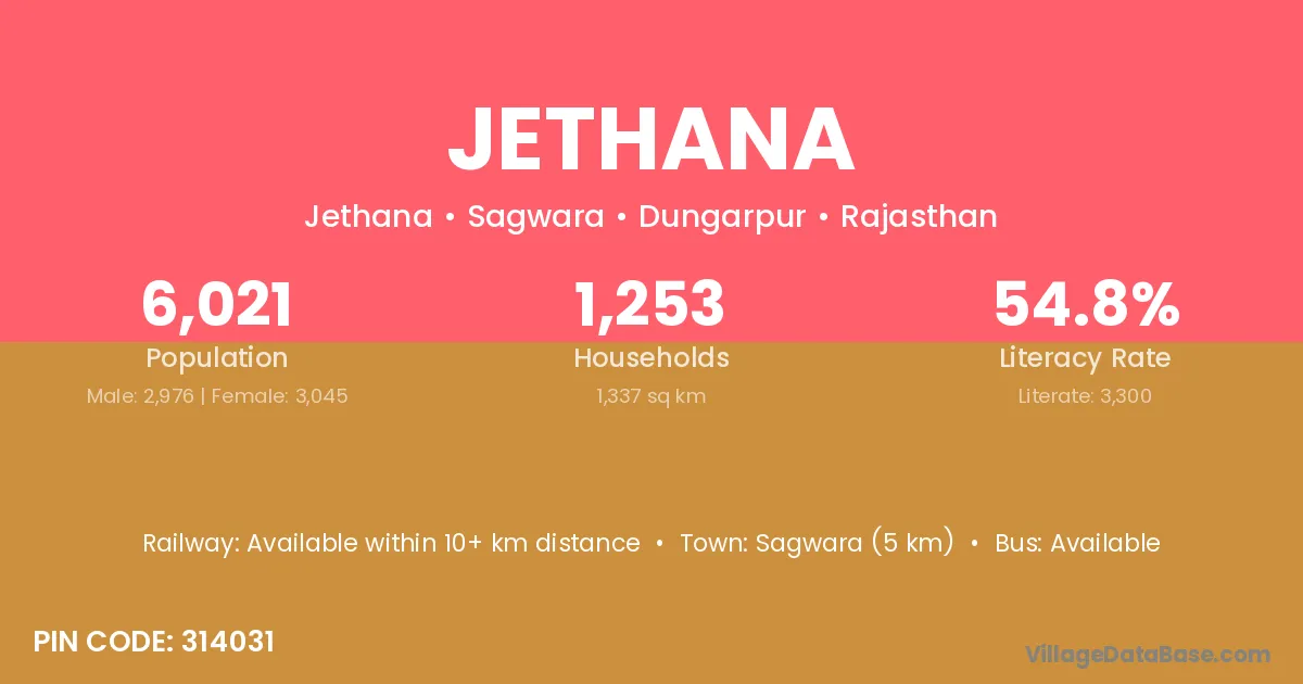 The literacy rate of Jethana village is 67.74%. Male literacy stands at 78.19% and female literacy at 56.58%.