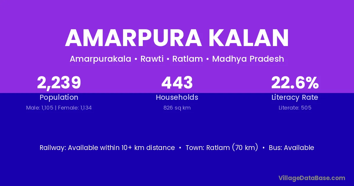 Ratlam (70 km) is the nearest town to Amarpura Kalan village for major economic activities and is located approximately 70 km away.
