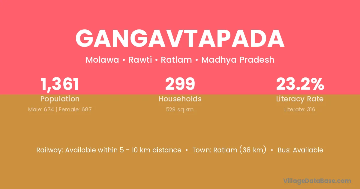 Ratlam (38 km) is the nearest town to Gangavtapada village for major economic activities and is located approximately 38 km away.