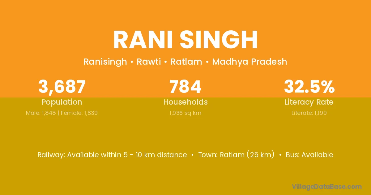 Ratlam (25 km) is the nearest town to Rani Singh village for major economic activities and is located approximately 25 km away.
