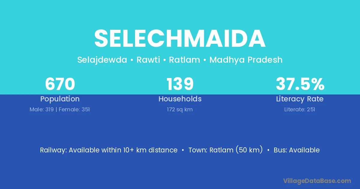 Ratlam (50 km) is the nearest town to Selechmaida village for major economic activities and is located approximately 50 km away.