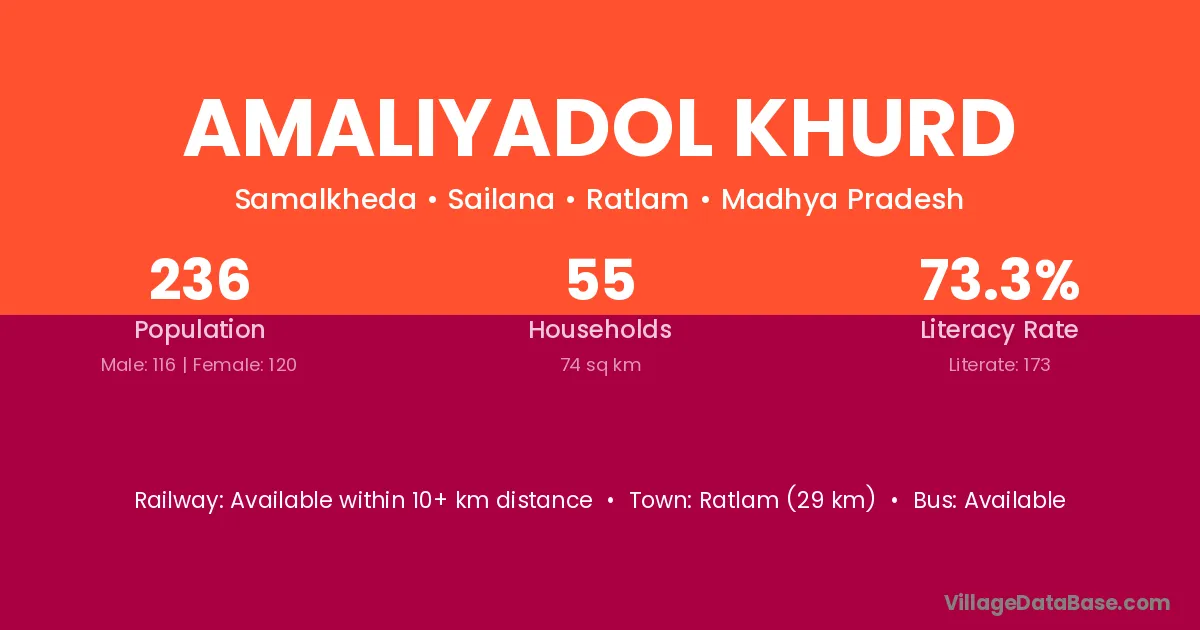 Amaliyadol Khurd village has a total population of 236 people, of which 116 are males and 120 are females.