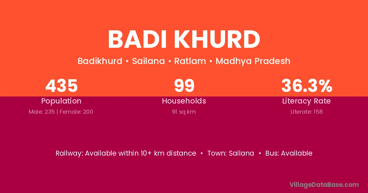 Badi Khurd village has a total population of 435 people, of which 235 are males and 200 are females.
