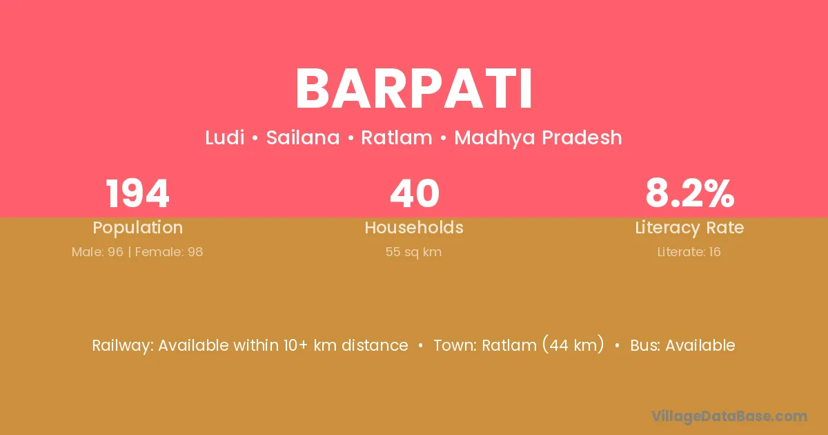 Ratlam (44 km) is the nearest town to Barpati village for major economic activities and is located approximately 44 km away.