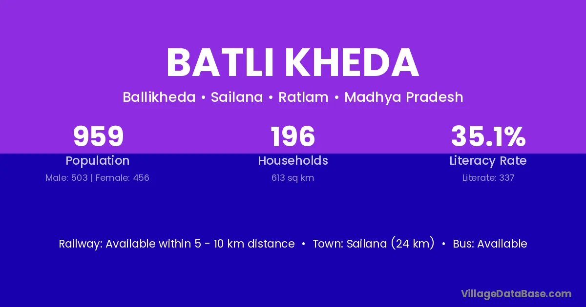 Sailana (24 km) is the nearest town to Batli Kheda village for major economic activities and is located approximately 24 km away.