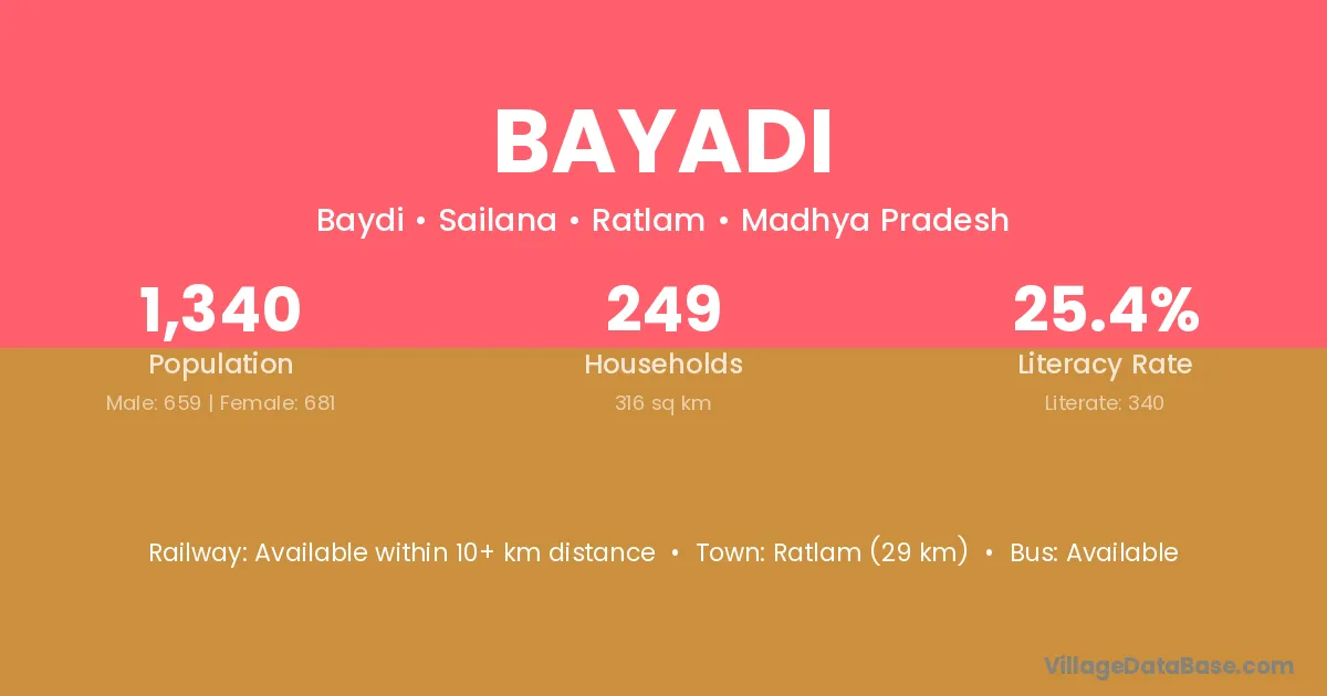 Ratlam (29 km) is the nearest town to Bayadi village for major economic activities and is located approximately 29 km away.
