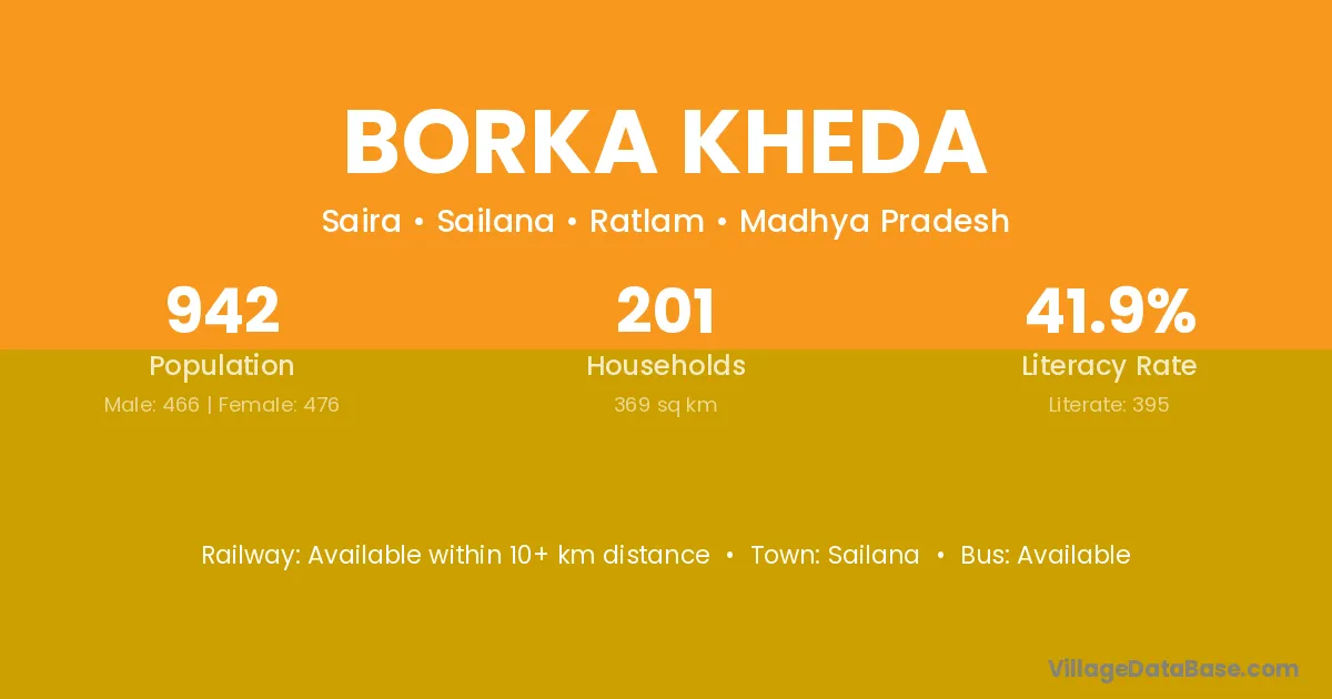 Borka Kheda village has a total population of 942 people, of which 466 are males and 476 are females.