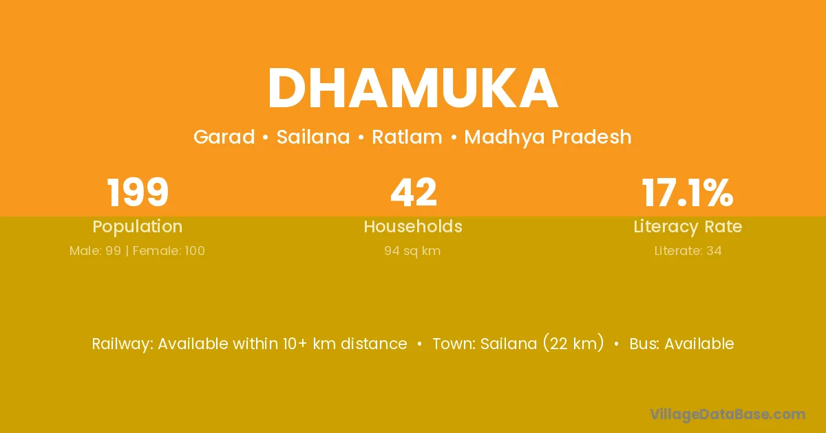 Sailana (22 km) is the nearest town to Dhamuka village for major economic activities and is located approximately 22 km away.