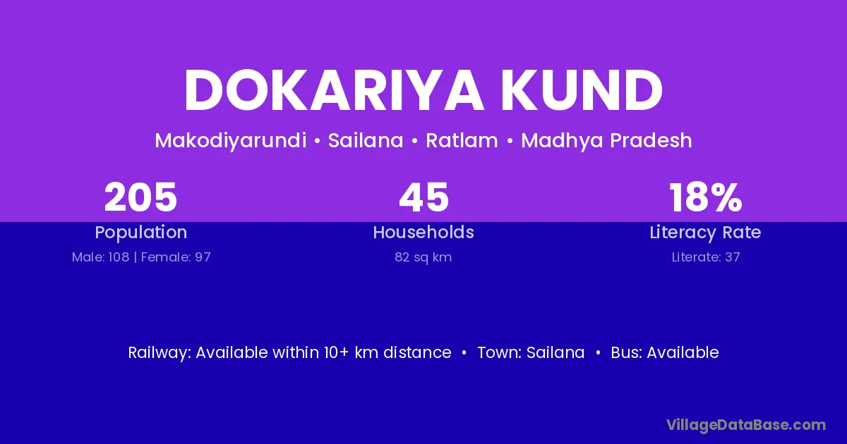Dokariya Kund village has a total population of 205 people, of which 108 are males and 97 are females.