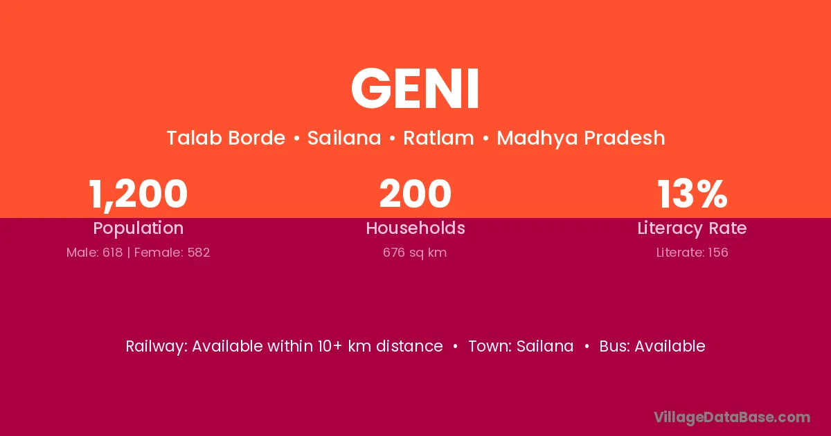 Geni village has a total population of 1,200 people, of which 618 are males and 582 are females.