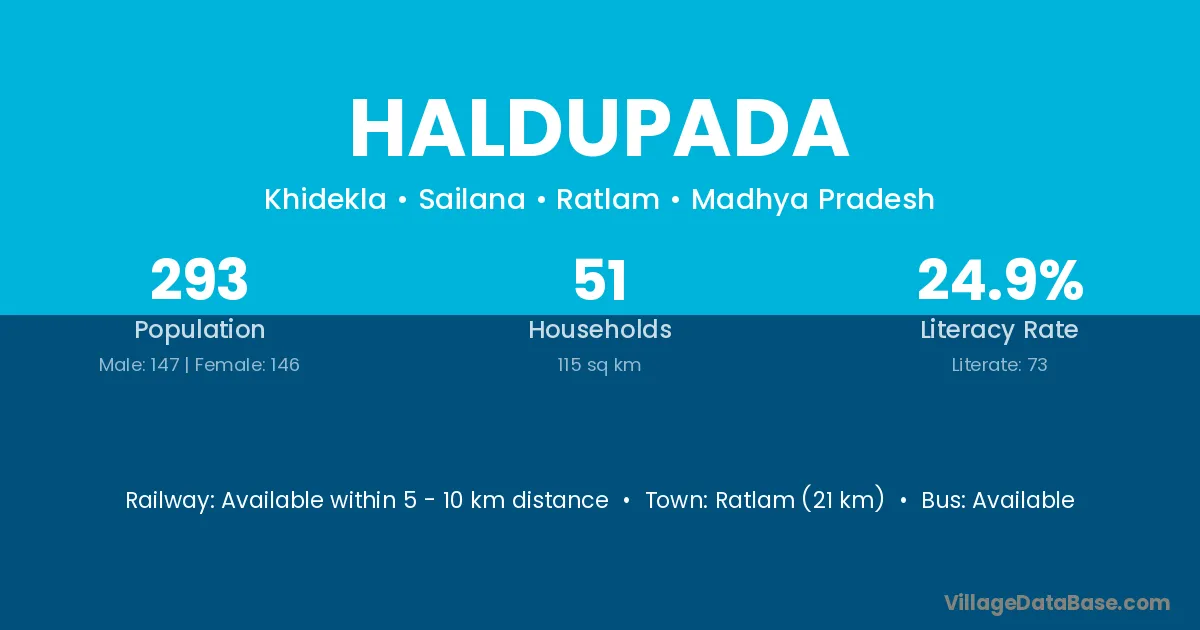 Ratlam (21 km) is the nearest town to Haldupada village for major economic activities and is located approximately 21 km away.