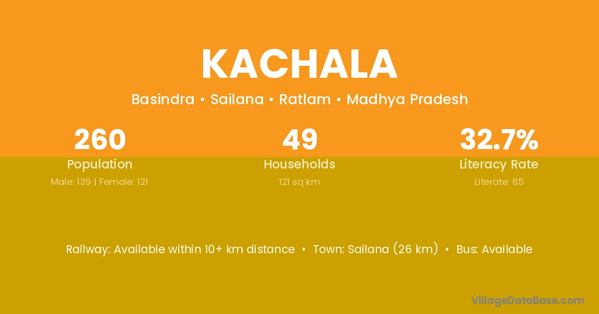 Sailana (26 km) is the nearest town to Kachala village for major economic activities and is located approximately 26 km away.