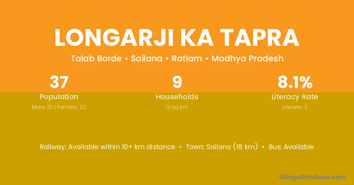 Sailana (18 km) is the nearest town to Longarji Ka Tapra village for major economic activities and is located approximately 18 km away.