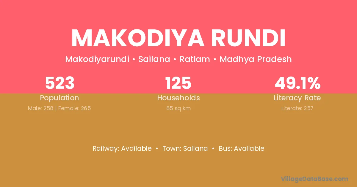 Makodiya Rundi village has a total population of 523 people, of which 258 are males and 265 are females.