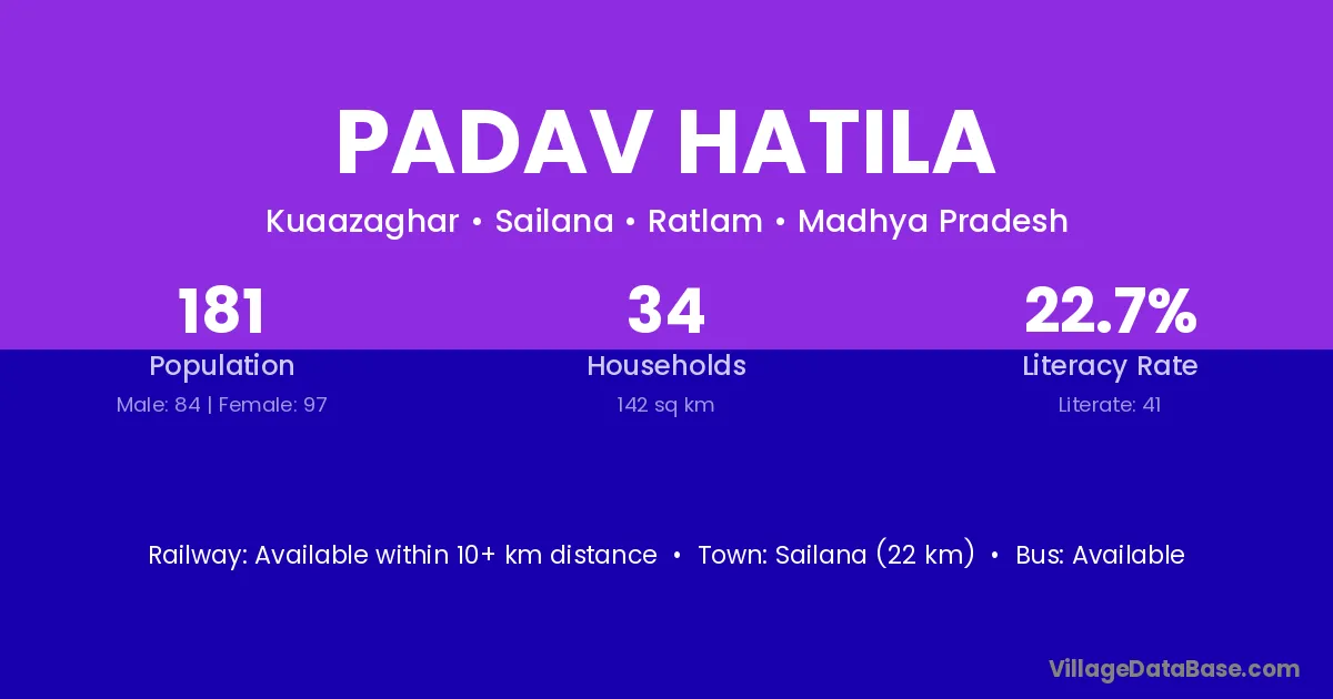 Sailana (22 km) is the nearest town to Padav Hatila village for major economic activities and is located approximately 22 km away.