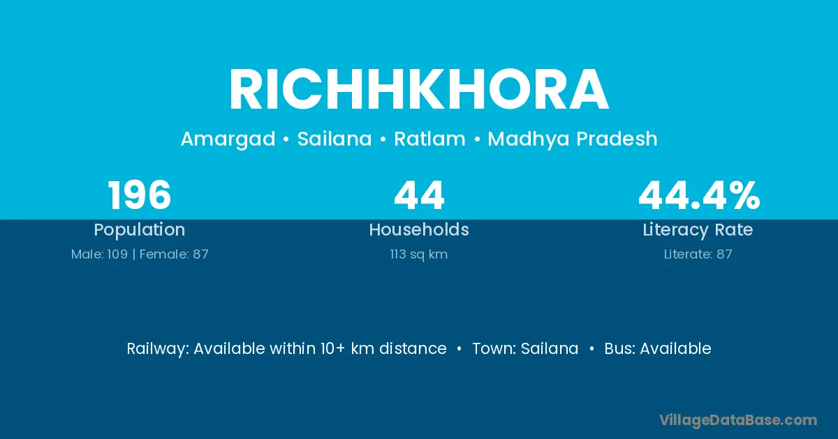 Richhkhora village has a total population of 196 people, of which 109 are males and 87 are females.