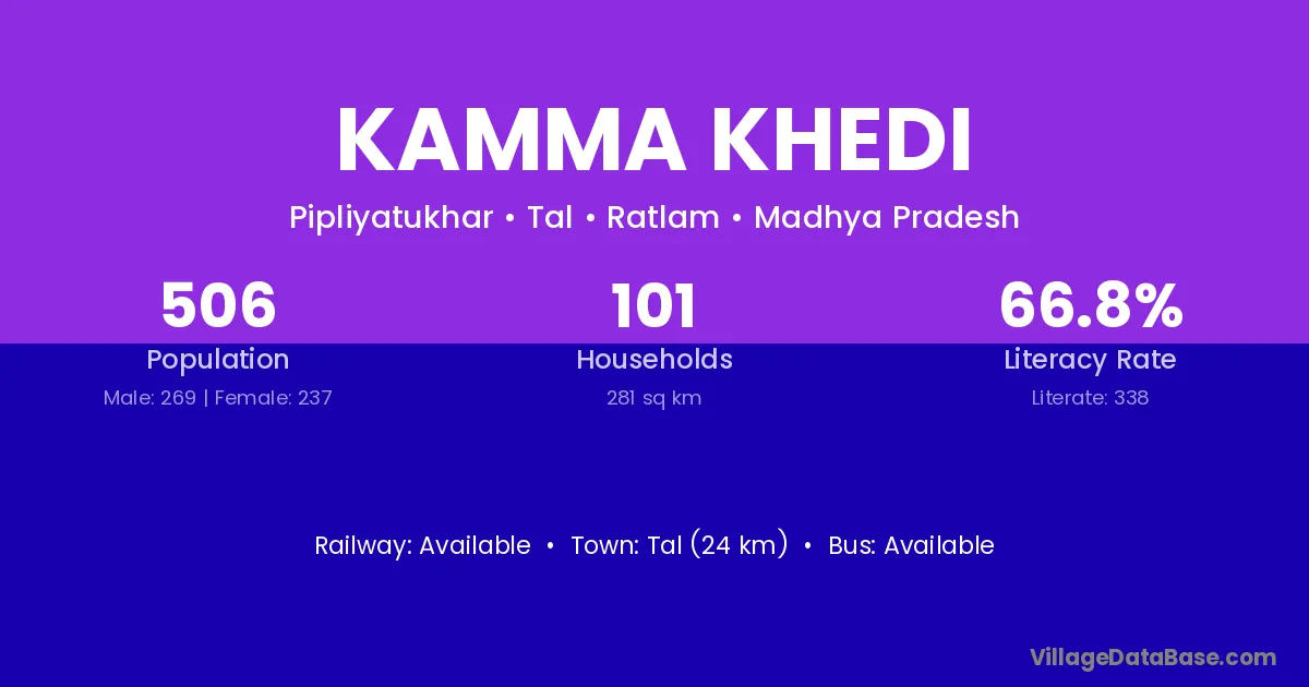 Kamma Khedi village has a total population of 506 people, of which 269 are males and 237 are females.