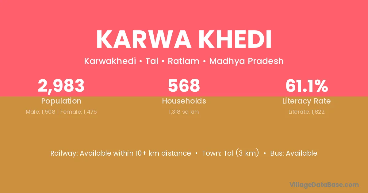 Karwa Khedi village has a total population of 2,983 people, of which 1,508 are males and 1,475 are females.
