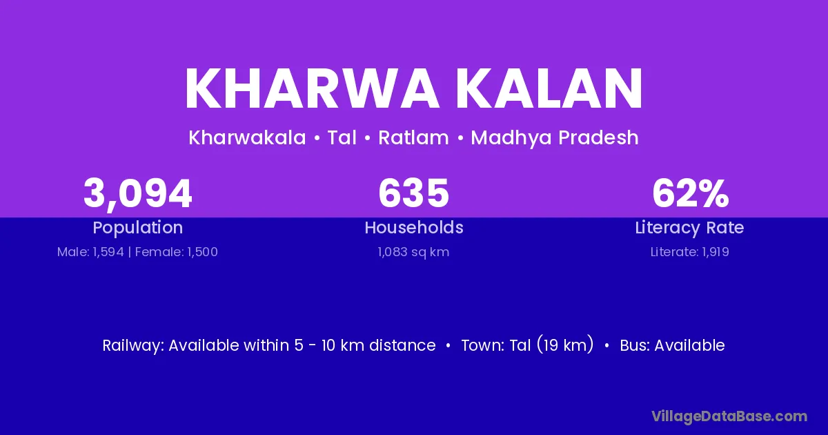 Kharwa Kalan village has a total population of 3,094 people, of which 1,594 are males and 1,500 are females.