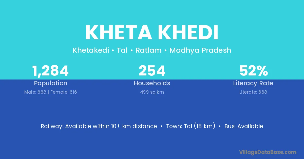 Kheta Khedi village has a total population of 1,284 people, of which 668 are males and 616 are females.