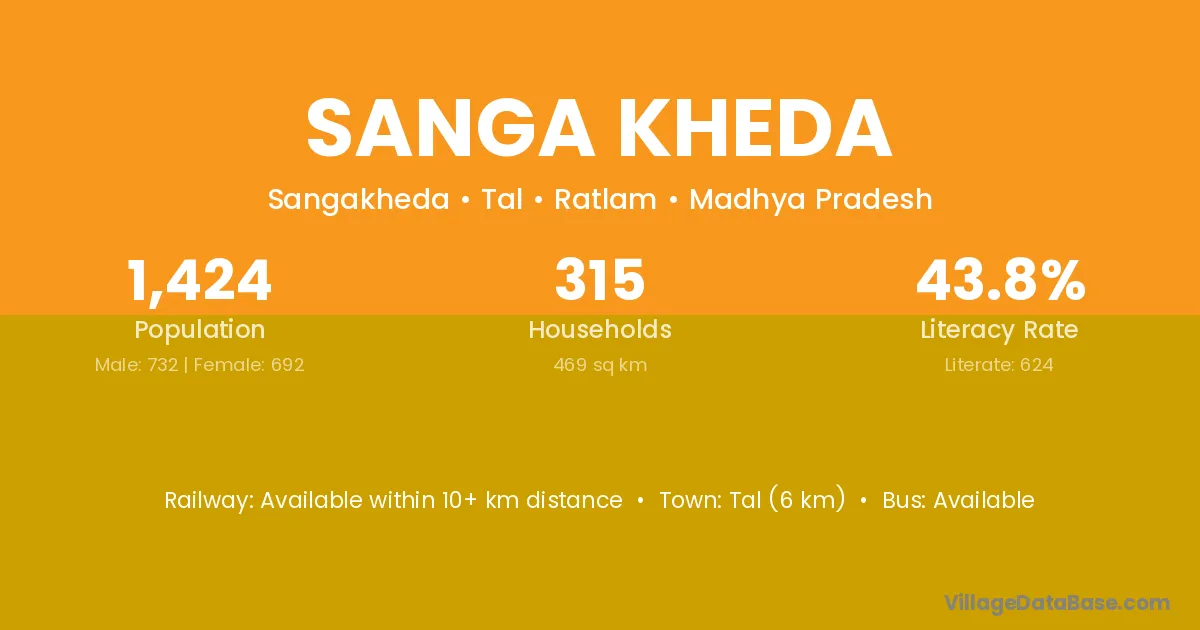 Sanga Kheda village has a total population of 1,424 people, of which 732 are males and 692 are females.