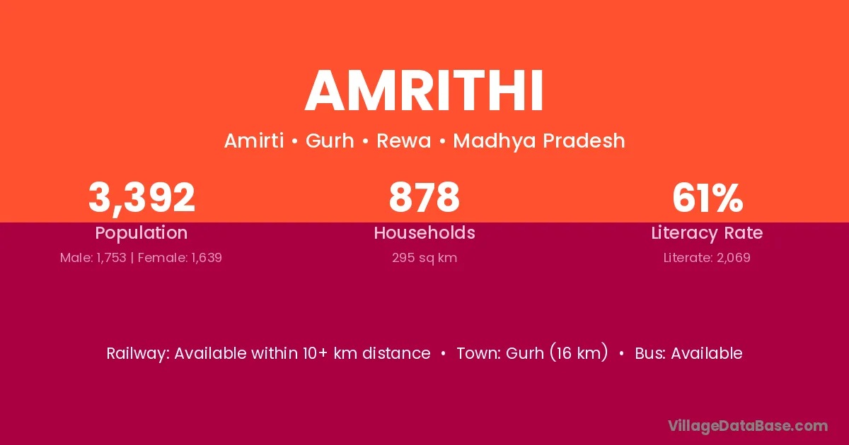 Gurh (16 km) is the nearest town to Amrithi village for major economic activities and is located approximately 16 km away.