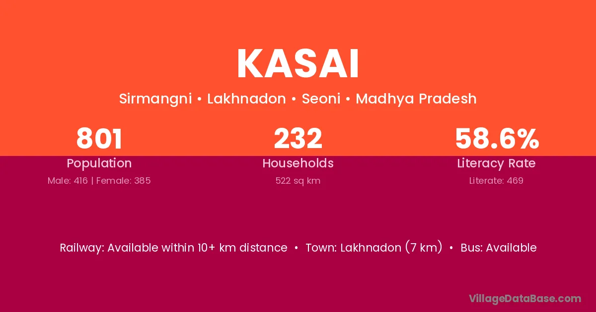 Kasai village has a total population of 401 people, of which 196 are males and 205 are females.