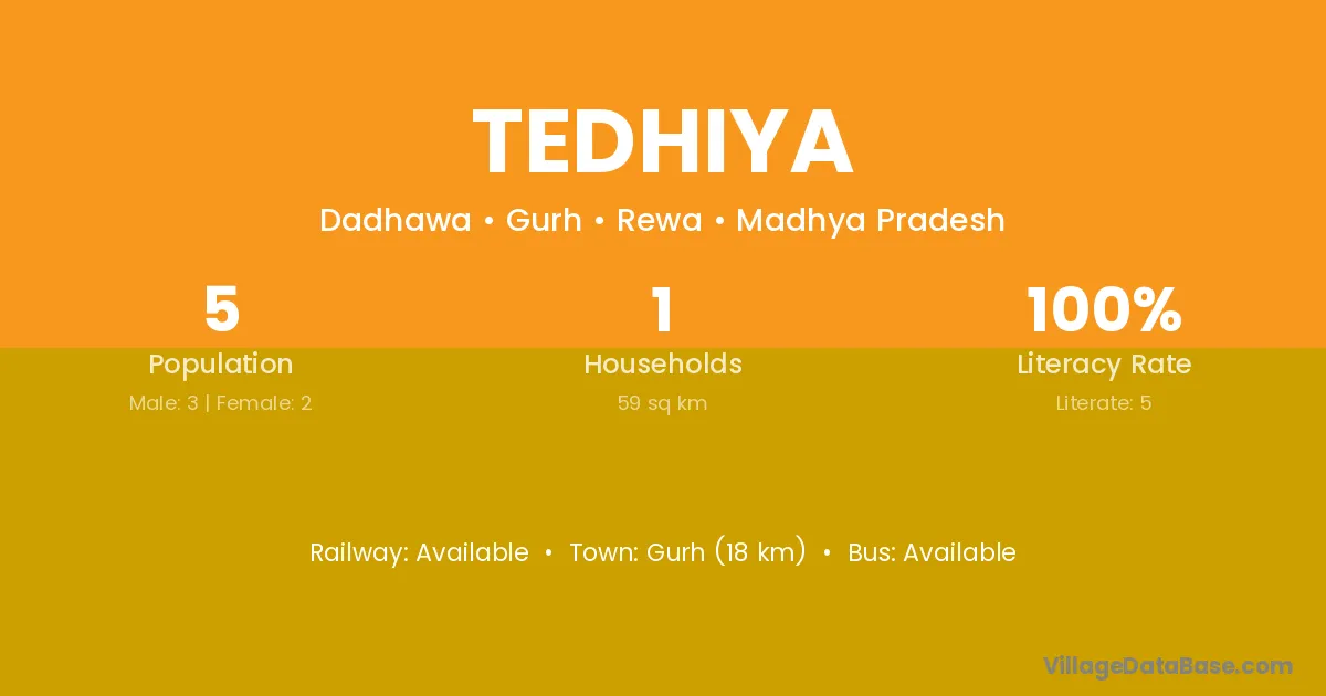 Gurh (18 km) is the nearest town to Tedhiya village for major economic activities and is located approximately 18 km away.