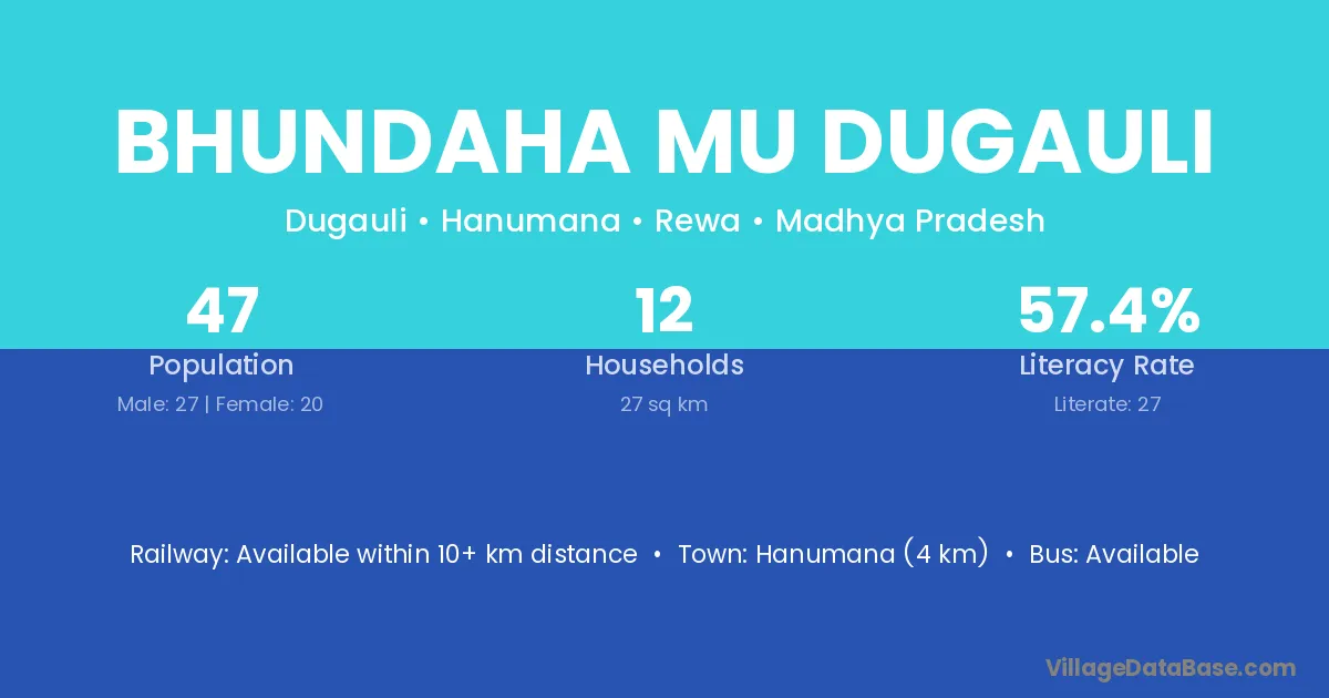 Bhundaha Mu Dugauli village has a total population of 47 people, of which 27 are males and 20 are females.