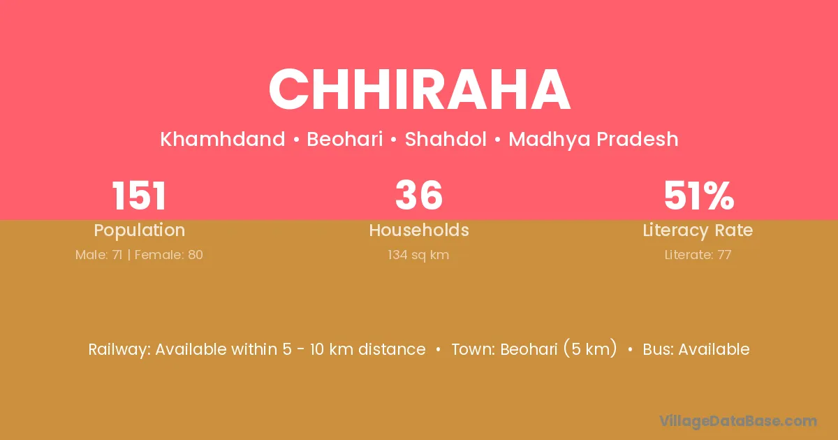 Hanumana (17 km) is the nearest town to Chhiraha village for major economic activities and is located approximately 17 km away.