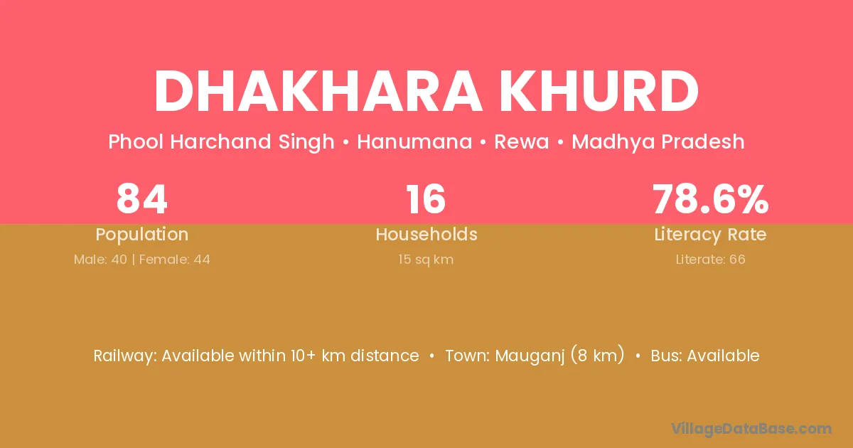 Dhakhara Khurd village has a total population of 84 people, of which 40 are males and 44 are females.