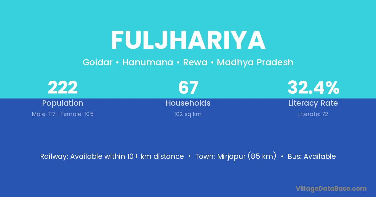 Mirjapur (85 km) is the nearest town to Fuljhariya village for major economic activities and is located approximately 85 km away.