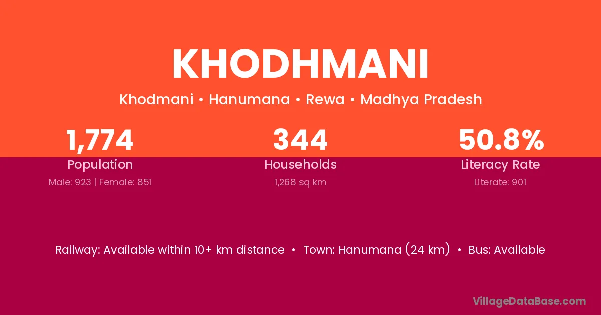 Hanumana (24 km) is the nearest town to Khodhmani village for major economic activities and is located approximately 24 km away.