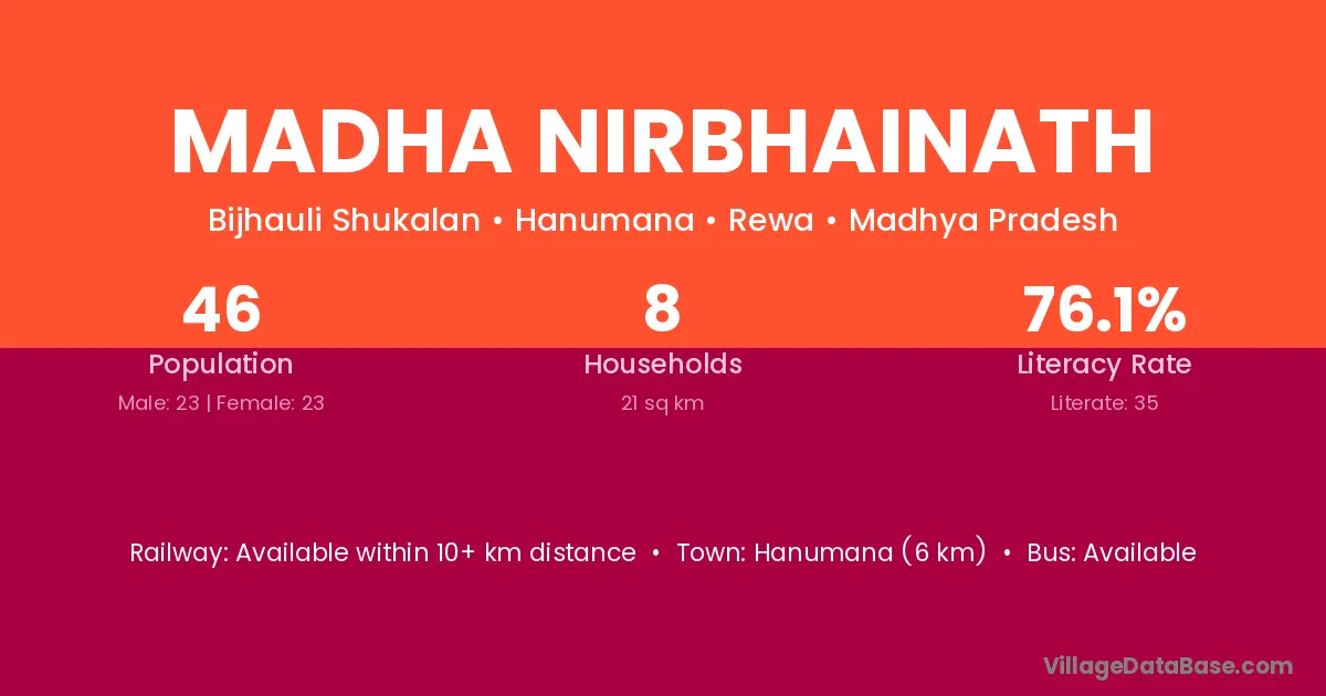 Madha Nirbhainath village has a total population of 46 people, of which 23 are males and 23 are females.