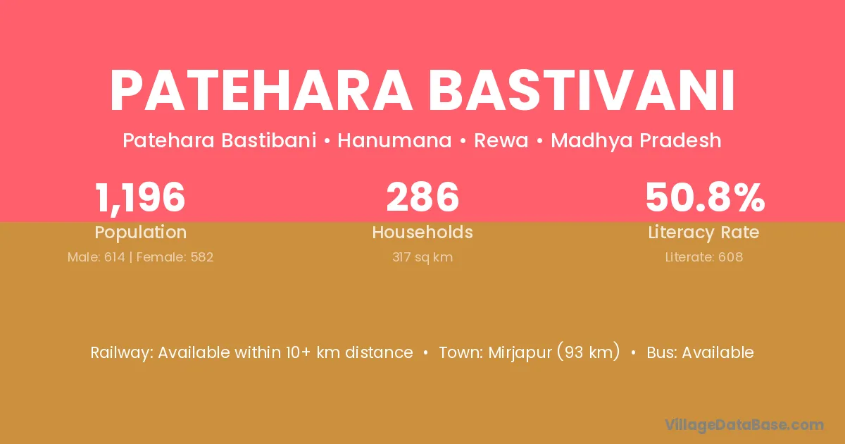 Patehara Bastivani village has a total population of 1,196 people, of which 614 are males and 582 are females.