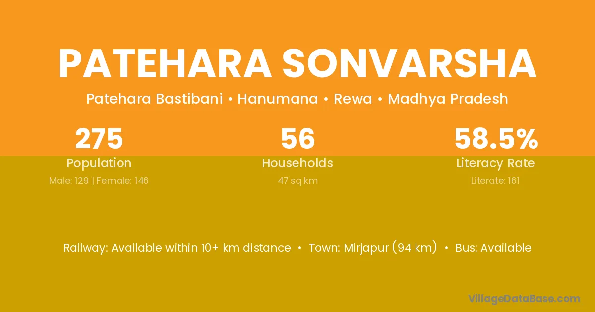 Patehara Sonvarsha village has a total population of 275 people, of which 129 are males and 146 are females.