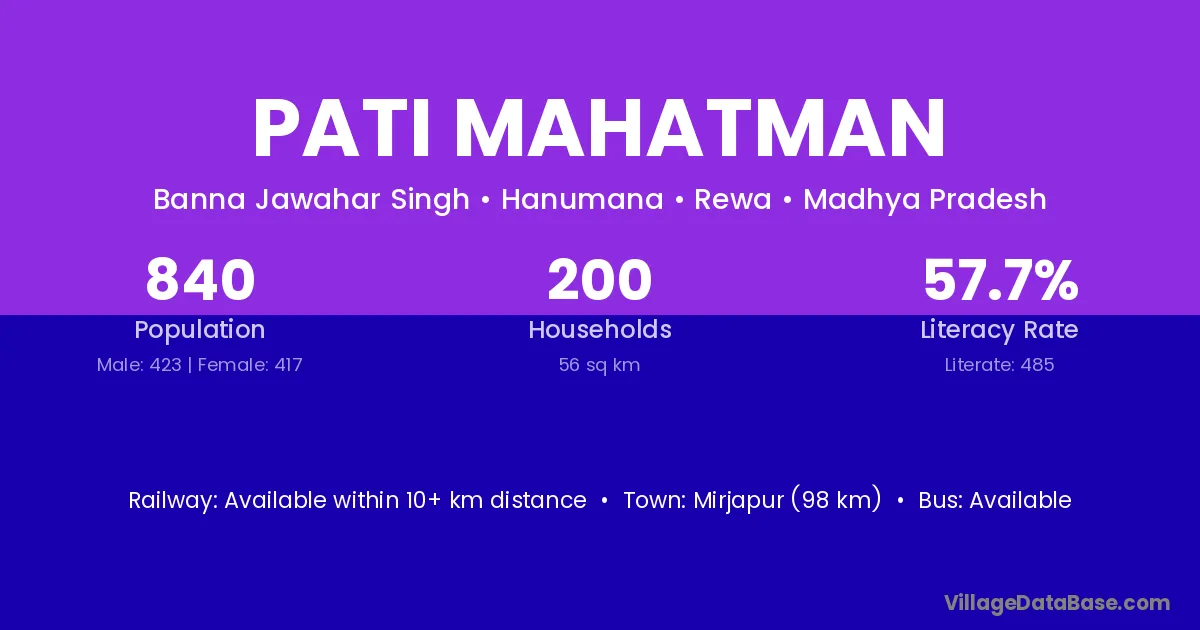 Pati Mahatman village has a total population of 840 people, of which 423 are males and 417 are females.