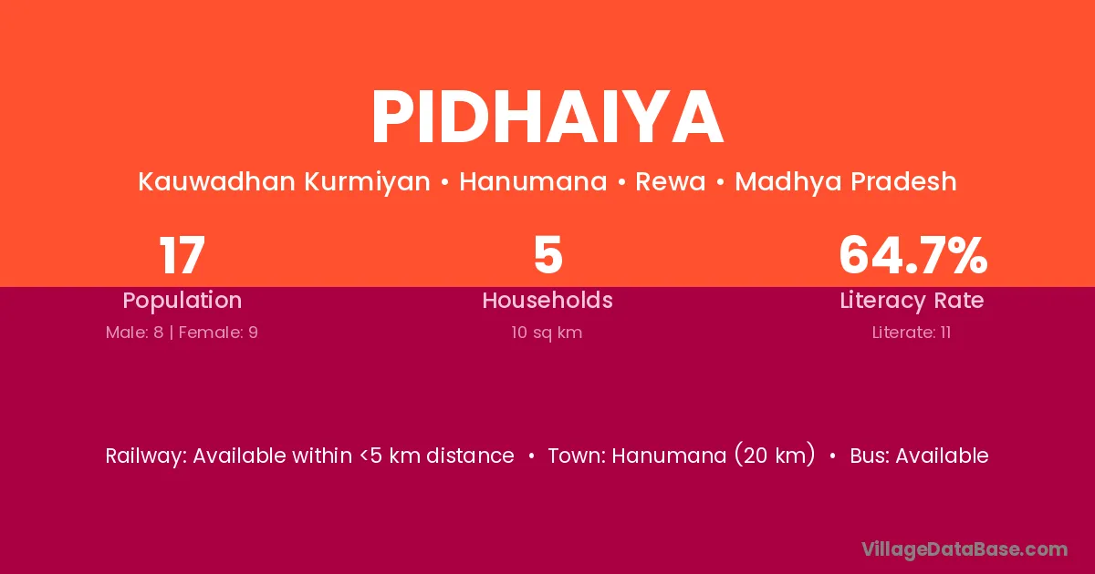 Hanumana (20 km) is the nearest town to Pidhaiya village for major economic activities and is located approximately 20 km away.