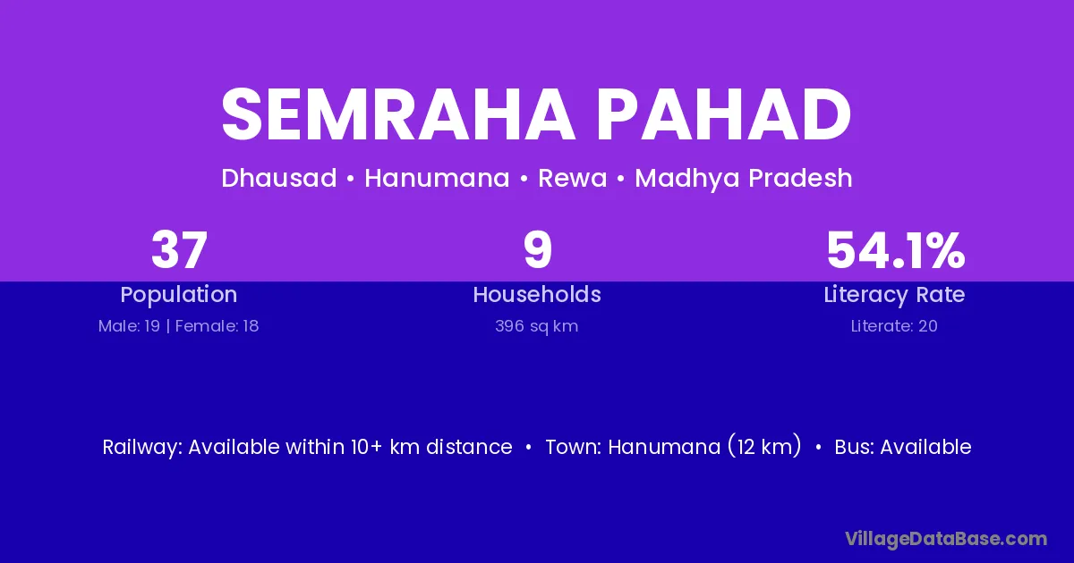 Hanumana (12 km) is the nearest town to Semraha Pahad village for major economic activities and is located approximately 12 km away.