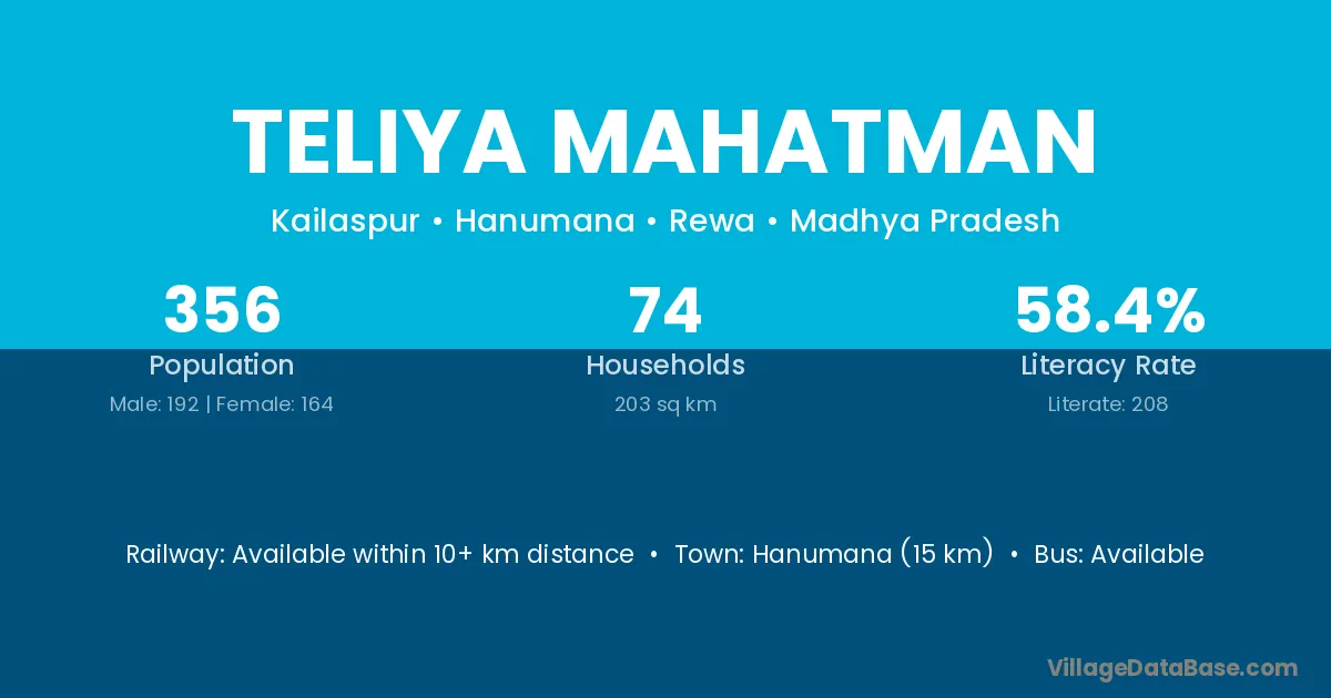 Hanumana (15 km) is the nearest town to Teliya Mahatman village for major economic activities and is located approximately 15 km away.