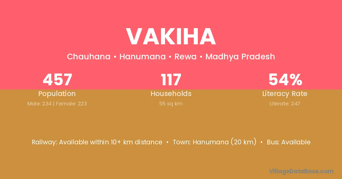 Hanumana (20 km) is the nearest town to Vakiha village for major economic activities and is located approximately 20 km away.