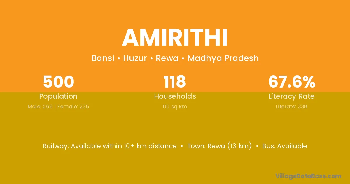 Rewa (13 km) is the nearest town to Amirithi village for major economic activities and is located approximately 13 km away.