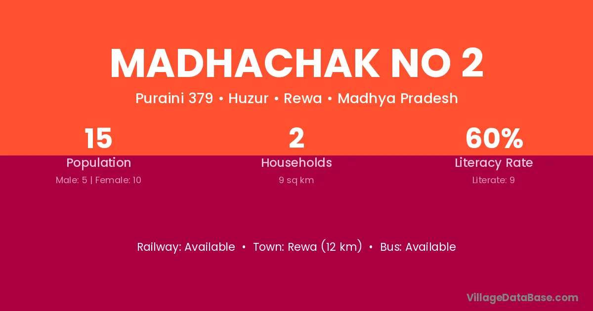 Rewa (12 km) is the nearest town to Madhachak No 2 village for major economic activities and is located approximately 12 km away.