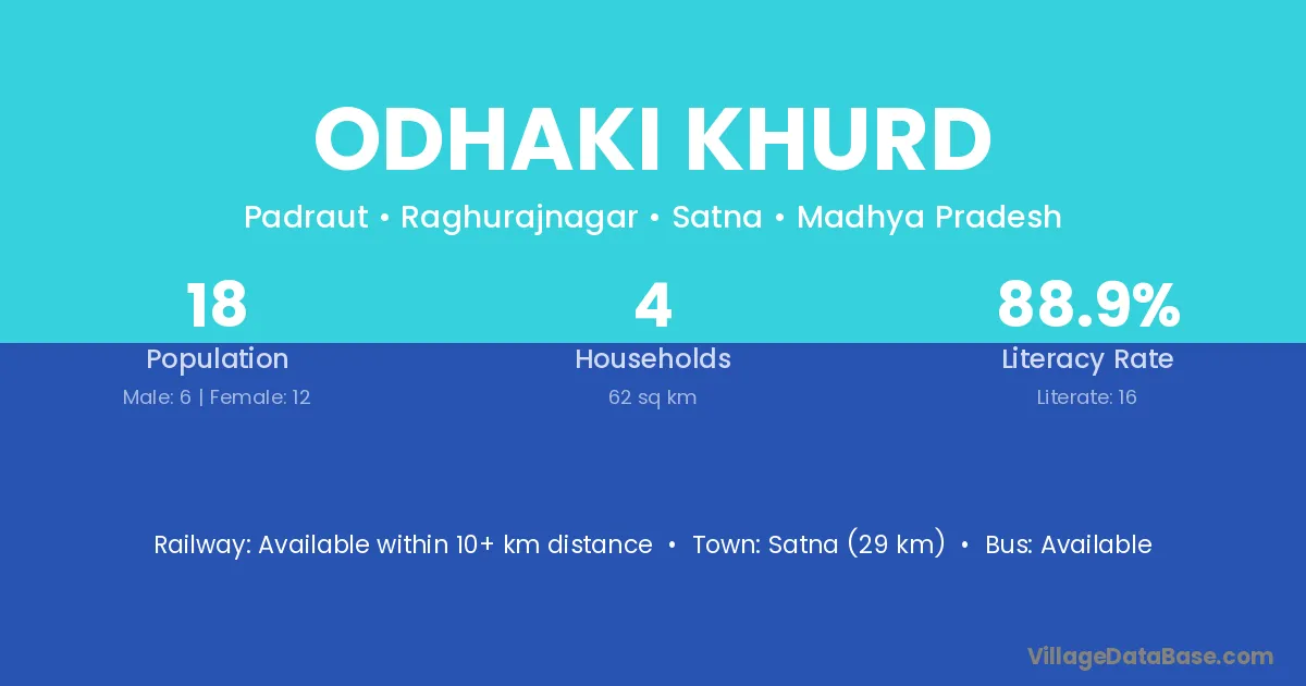 Rewa (13 km) is the nearest town to Odhaki Khurd village for major economic activities and is located approximately 13 km away.